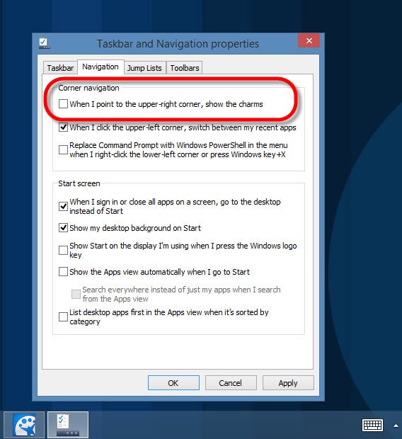 Anschließend können Sie unter Naviagation die Einblendung der Charms-Bar mit der oberen Klickbox abschalten.
