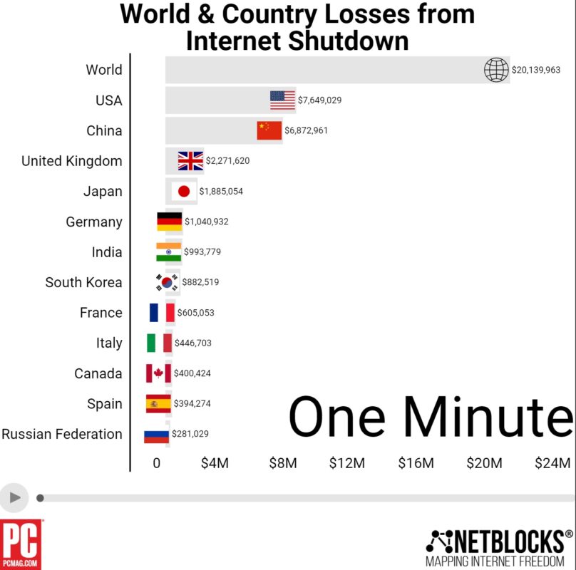 Die Schätzungen zeigen, dass eine einzige Minute vollständiger Internetunterbrechung die Weltwirtschaft über 20 Millionen Dollar kosten würde. Die Vereinigten Staaten wären am stärksten betroffen, mit einem Verlust von 7,6 Millionen Dollar, gefolgt von China (6,8 Millionen), dem Vereinigten Königreich (2,2 Millionen), Japan (1,8 Millionen) und Deutschland (1 Million).