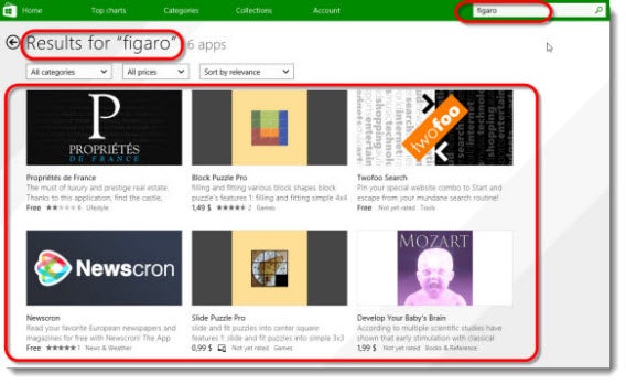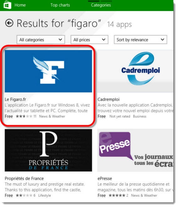 Bei einer erneuten Suche nach Le Figaro zeigt der Windows Store jetzt auch die französische App an.