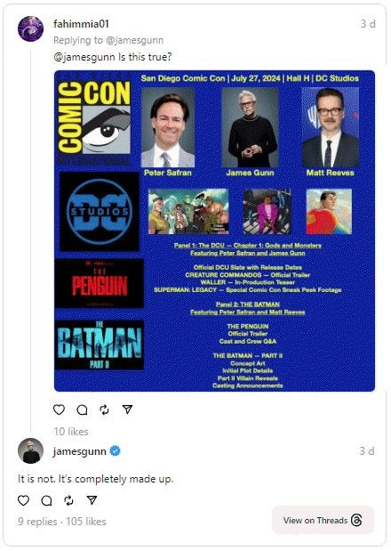 Nachdem er bereits viele Gerüchte über das DC-Universum behandelt hatte, wurde James Gunn kürzlich auf Threads, dem sozialen Netzwerk von Meta, gefragt, ob ein Plakat für die San Diego Comic-Con 2024 mit einem Programm für DC Studios wahr oder falsch sei.