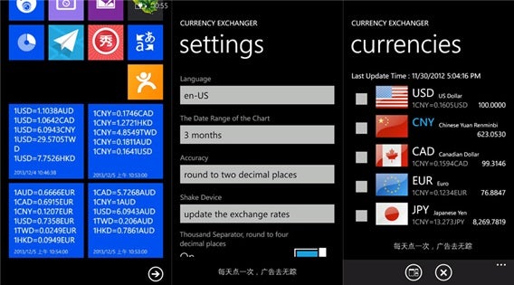 Beim Geldumtausch in andere Währungen kommt man schnell durcheinander. Mit dem Currency Exchanger Free haben Sie auch dieses Problem im Griff. Die App lädt aktuelle Wechselkurse für beliebige Währungen aus dem Internet. So sehen Sie mit einem Blick, ob der Umtauschkurs einer Wechselstube gut ist oder nicht. Mit Live-Kacheln zeigen Sie Wechselkurse auf Wunsch auch auf dem Startbildschirm an.