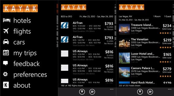 Die Kayak App für Windows Phone arbeitet ähnlich wie Expedia, findet allerdings zusätzlich Mietwagen. Vom Design her wirkt die Kayak App für Windows Phone moderner und ist auch angenehmer zu bedienen. Wie bei Expedia gibt es auch hier Gästebenotungen für Hotels, in diesem Fall aber von der Partnerseite booking.com. Kayak wirbt mit dem Versprechen, besonders günstige Preise für Buchungen anbieten zu können.