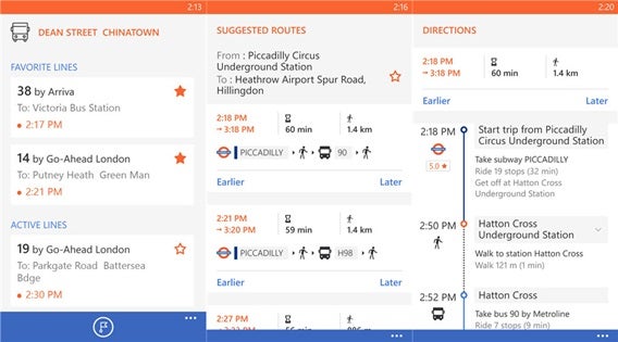 Wenn Sie statt Taxis lieber den Nahverkehr nutzen, ist HERE Transit für Windows Phone Gold wert. Sie geben einfach Ihren Zielpunkt ein und HERE Transit erledigt den Rest. Die App schlägt verschiedene Routen vor und kalkuliert inklusive Fußweg die zu erwartende Ankunftszeit. Sie können die Suche auf bestimmte Verkehrsmittel wie U-Bahn oder Bus einschränken. Auf dem Fußweg hilft ein interaktiver Kompaß unter Zuhilfenahme der Kamera weiter.