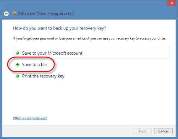 Im nächsten Schritt erstellen Sie einen Rettungs-Schlüssel. Falls Sie später das Passwort vergessen oder verlieren, hilft nur noch dieser Notfall-Code weiter. Wir empfehlen Ihnen diesen Schlüssel entweder als Datei oder auf Papier an einem sicheren Ort zu archivieren.