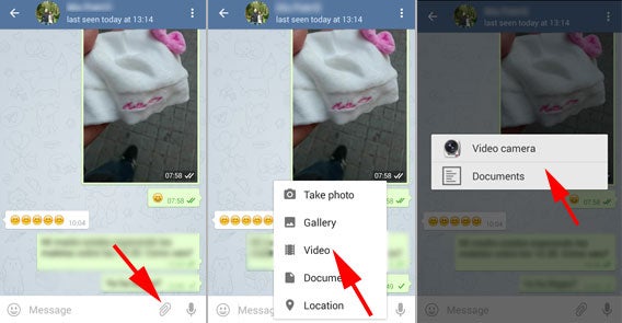 Um ein Video mit Telegram zu verschicken, klickt man im Chat auf das Büroklammer-Symbol unten rechts und wählt Video aus. Will man das Video nun aufnehmen, tippt man auf Video camera. Versendet man ein gespeichertes Video, wählt man Documents aus und entscheidet sich für einen Film aus der Galerie.