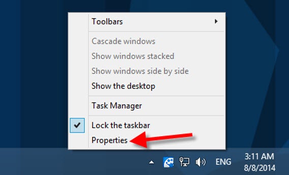 Klicken Sie mit der rechten Maustaste auf eine leere Stelle auf der Taskleiste und anschließend auf Eigenschaften.