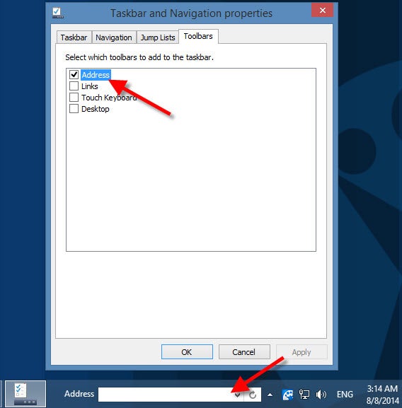 Setzen Sie das Häkchen bei Adresse und klicken Sie auf OK. Die Adressleiste in der Taskleiste wird sofort sichtbar.