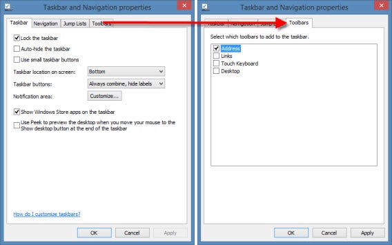 Hier finden Sie verschiedenste Einstellungsmöglichkeiten für die Taskleiste. Die Option für das Eingabefeld ist etwas versteckt im Untermenü Toolbars ganz rechts.