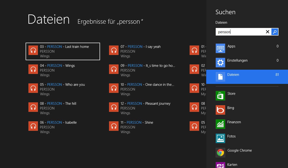 Kontrollieren Sie Ihre Eingaben, indem Sie im Startmenü nach einem Lied aus E:/Musik suchen.