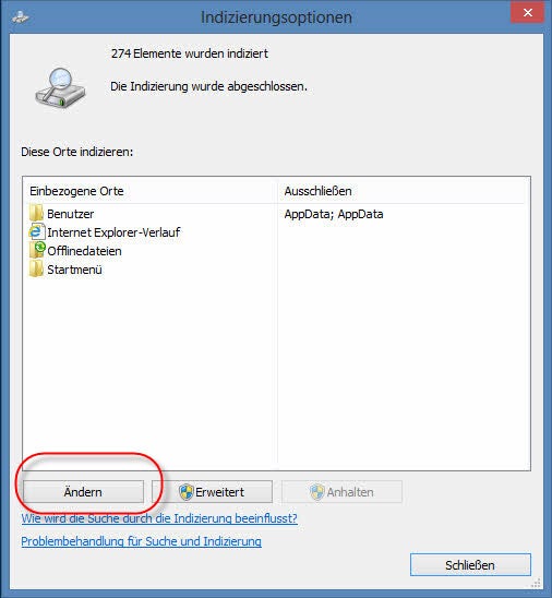 Es öffnet sich das Fenster Indizierungsoptionen. Hier sehen Sie alle von der Windows-Suche überwachten Ordner. Klicken Sie auf die Schaltfläche Ändern, um Dateien zu indexieren.