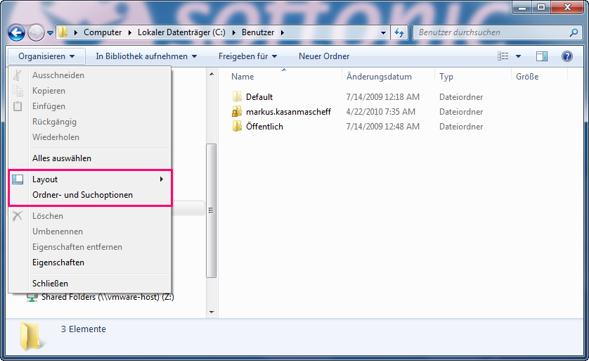 Nach Auswahl von Automatisch auf aktuellen Ordner erweitern markiert Windows 7 im Verzeichnisbaum immer den im rechten Feld geöffneten Pfad. Mit der Option Alle Ordner anzeigen sieht man im Explorer wie früher üblich alle CD-, DVD- und Festplattenlaufwerke, den Papierkorb sowie den Netzwerke-Ordner auf einen Blick.