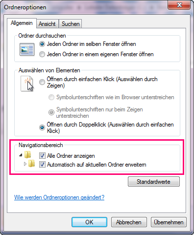 Die Änderung nimmt man über den Menüpunkt Organisieren unter den Ordner- und Suchoptionen vor.