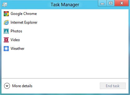 Beim ersten Öffnen zeigt sich der Windows 8 Task-Manager in seiner schlanken Variante. Weniger erfahrene Benutzer schließen in dieser Ansicht hängende Programme und werden nicht mit überflüssigen Details belastet.