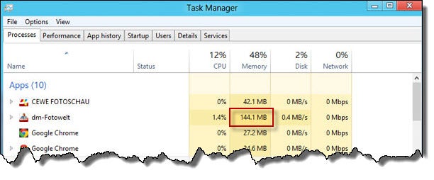 Der Windows 8 Task-Manger zeigt alle auf Ihrem Rechner laufenden Programme, Apps und Prozesse, egal ob sie unter der Desktop- oder der Windows 8 Oberfläche laufen. Sie können also beispielsweise die Desktop-Software Photoshop von dem gleichen Fenster aus beenden wie die App Fotos.