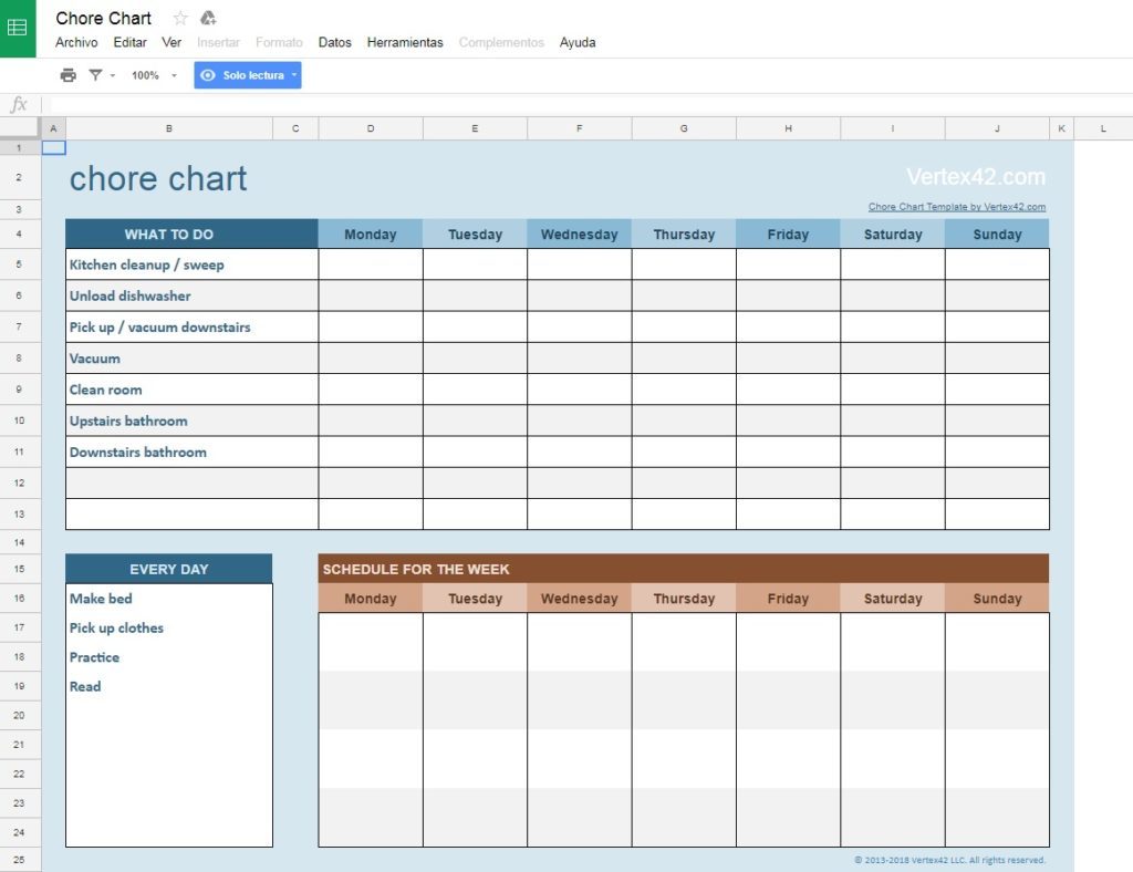 Weekly chores: If the previous template was simple, this one definitely isn’t. With this spreadsheet, we can write weekly tasks in a detailed fashion. It’s the template’s greatest virtue and greatest vice that you have to keep updating it every time you get to Sunday. Mind you; it’s great for the family.