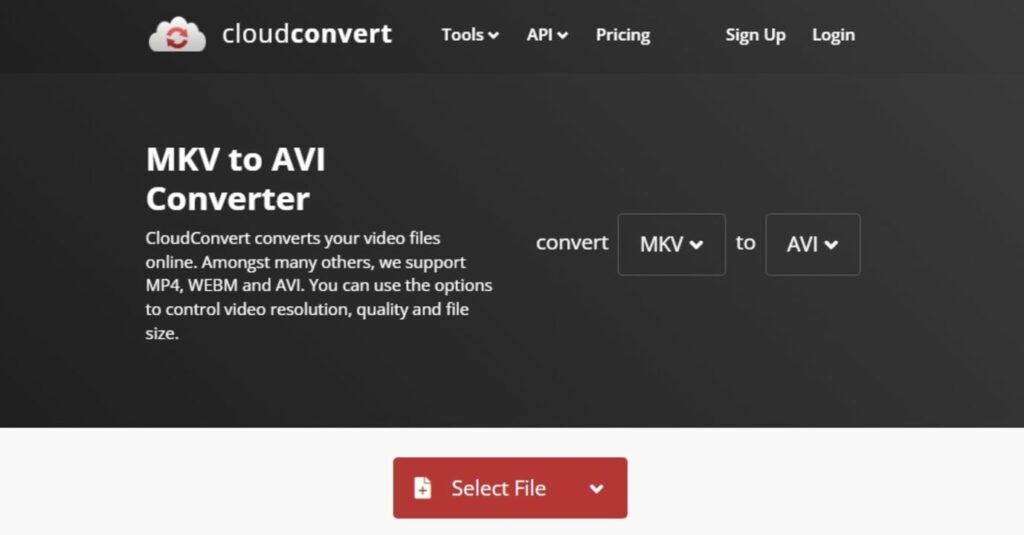 You can easily convert any file format from CloudConvert. To do so, visit its official website and select “MKV” and “AVI” or “MP4” from the “Convert” drop-down menu. After that, click the “Select File” button and upload the video file you want to convert. You can also convert files directly from a URL or from cloud services such as Google Drive, Dropbox or OneDrive.