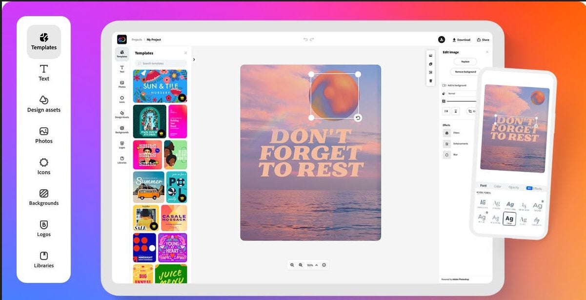 Adobe Express stands out for its accessibility, designed for both professional and non-professional designers. It offers a seamless user experience that caters to a wide range of skill levels. For seasoned creators, Adobe Express provides quick access to essential tools and advanced features that expedite the design process. For novices, the intuitive interface, combined with step-by-step guidance and smart AI features, ensures that even those with no design background can produce high-quality content. The tool’s versatility is enhanced by its availability across multiple platforms, allowing users to sync their projects across devices and work from anywhere. This level of flexibility is crucial for influencers who need to create and publish content on the go, ensuring they remain relevant and engaging to their audience.