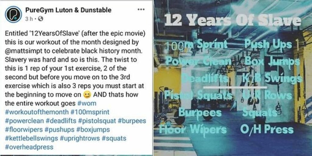 In 2020, a chain of gyms in the United Kingdom decided to announce the exercises for that month (such as sprinting a hundred meters, squats, burpees, etc.) under a specific name. Of course, they could have chosen a name like “Get in Shape” or “Get Your Body Moving,” but instead, they launched it as “12 Years of Slavery.” It was not a coincidence: they intended to celebrate Black History Month. It was a major misstep.
