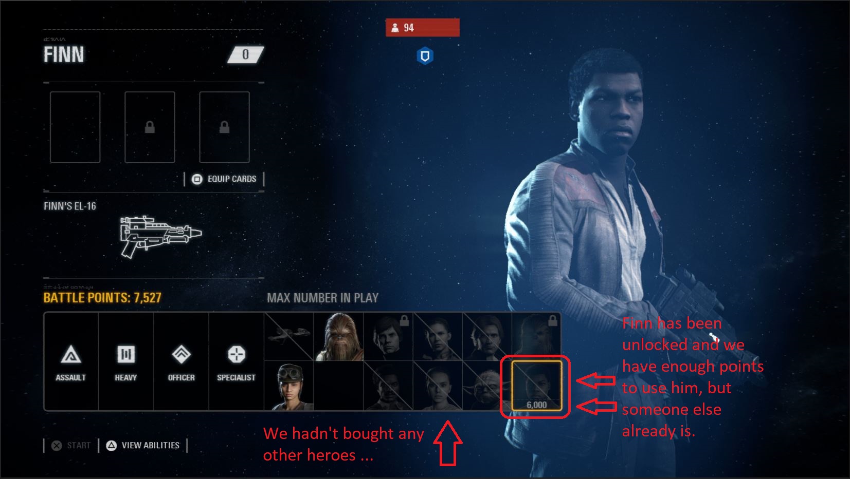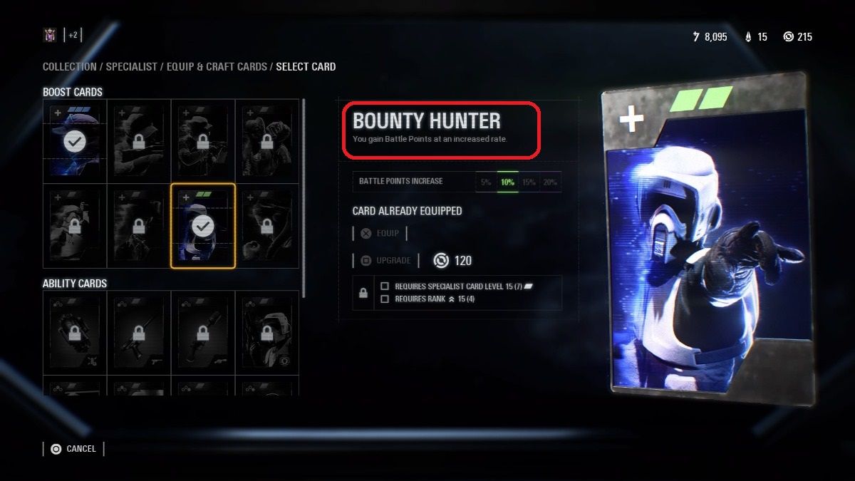 Both Infiltrator Reinforcements come with an array of new Star Cards to increase their survival, allow more frequent use of abilities, or enhance their recon and scouting abilities. They’re worth giving a try at 2,000 battle points; those points come very easily in this mode, and there are fewer heroes to save up for; the mode only allows for in-era heroes, so there are fewer options available. However, all the heroes are priced at 4,000 battle points making them slightly easier to unlock than in Galactic Assault.