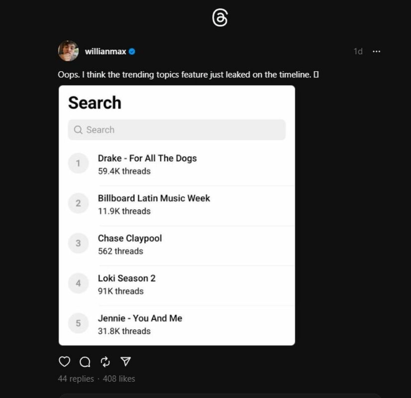 This expected feature was accidentally revealed over the weekend when a Threads employee “accidentally” published a screenshot. The snapshot showed a numbered list of popular subjects as well as the number of “threads” that were actively discussing each of these topics. Willian Max, an alert user, saw this development and suspected that the message was intended for internal use within Meta, the parent firm. You can see the screenshot below: