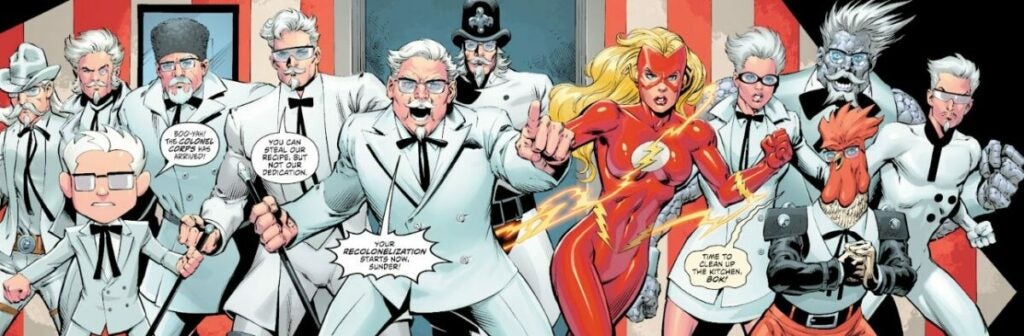 Perhaps it will surprise you, but these comics aren’t of the highest quality. They’re not terrible either – they have their moments. It’s amusing to encounter Colonel Bizarro, Cowboy Sanders, or Koln-El, an obvious parody of Superman. There was even a chicken-shaped Colonel that we won’t ask any further questions about. It all started with the presence of a certain Colonel Sunder, the creator of ‘Easy Fried Chicken,’ on Earth-3. He promised, “I sell cheap chicken, maybe it doesn’t taste good… but it’s easy to make! Fill your belly, that’s all that matters, forget Kentucky, Easy makes you happier.” Uh-huh.
