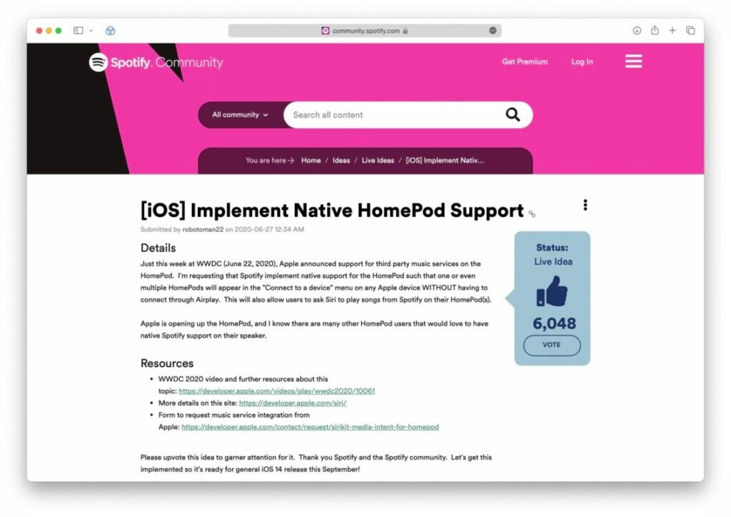 According to Bloomberg’s Mark Gurman, Spotify claims there has not been “a significant volume” of complaints from users regarding the lack of HomePod support. However, a post on Spotify’s community page advocating for native HomePod support has received more than 6,048 upvotes since it was posted in 2020. Although Apple has made the necessary APIs available to Spotify, the company seems unsure if it wants to take the plunge.