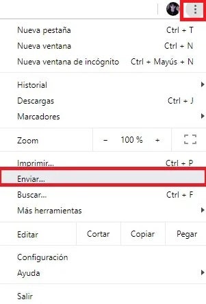 Now that you have Chrome installed, click on “Customize and control Google Chrome“. It is the icon in the form of three vertical dots that you will find in the upper right corner of the screen. Once the drop-down menu is open, click on the “Send” option. You will see that this will open a new selection from which you can interact with all the devices you have paired from Google Home.