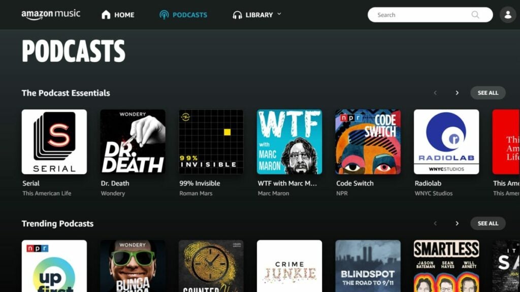 Amazon Music is an Amazon app that allows you to listen to thousands of popular and exclusive podcasts on various topics, from comedy to business, culture, sports, and more. With your Amazon Prime subscription, you can listen to podcasts on multiple devices, download them for offline listening, and easily follow all your favorite podcasts.