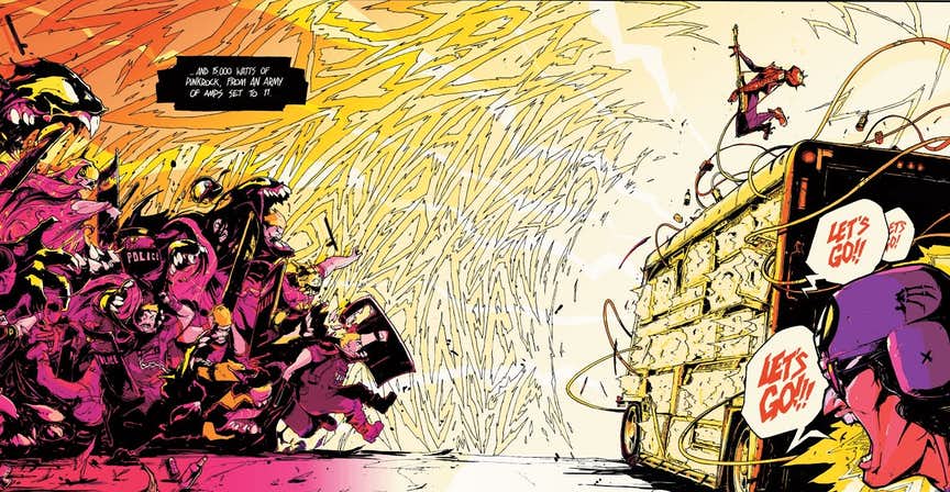In his series, Spider-Punk becomes the symbol and leader of a punk youth movement that fights against the government and its drones. In true punk style, the comic is stylish, loud, and unsubtle. This incarnation of the hero is Hobie Brown. In the mainstream Marvel Universe, he’s a young African-American inventor who is one of Spider-Man’s oldest allies. Spider-Punk hates being referred to as such, instead preferring to be called Spider-Man. Later on, he fights against time-traveling supervillain Kaine the Conqueror, who has become a CEO that sells Spider-Punk’s image. Spider-Punk fights him to take his image back as a symbol for revolution and freedom instead of a cheap, catchphrase-spouting mascot.