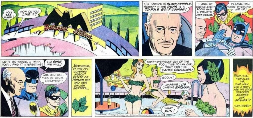 In reality, as you can see, it’s all a plan by Poison Ivy to rob the hotel guests, but that’s not what matters to us. What is certain is that Conrad Hilton’s appearance in the comic book caused an uproar in the hotel industry. After all, this was free publicity for his chain… And, apparently, advertising was denied in the press that brought out the daily strip. Don’t think that, after the controversy, he would say little: from January to March, Paris Hilton’s great-great-grandfather became a regular in the adventures of the Dynamic Duo.