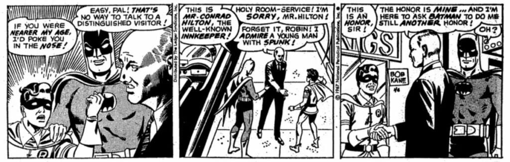 January 1967. Batman and Robin encounter a man sitting in the Batmobile (“Strange! Who would do such a thing in Gotham City?” says our hero). His name would remain a mystery until the next day, but the more seasoned reader would get to see the realistic caricature of Conrad Hilton. Hilton was born in 1887 and at the age of twenty was already in the hotel business. In fact, the world’s first hotel chain was (and is) named after him: he was famous to everyone… even Batman!