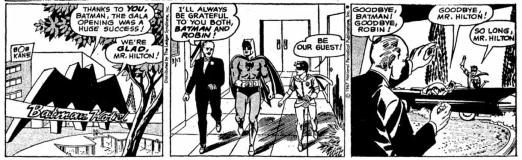 Hilton appeared in the strip to ask for help with the Batman Hotel he had designed (“Holy Taj Mahal!” says Robin) in which the waitresses wore Robin-inspired uniforms and the five-square-mile lake was designed with the Masked Crusader’s logo. It even had a golf bat-car that, as Batman notes, “It runs on BATs, surely.” This Batman, the things he has.