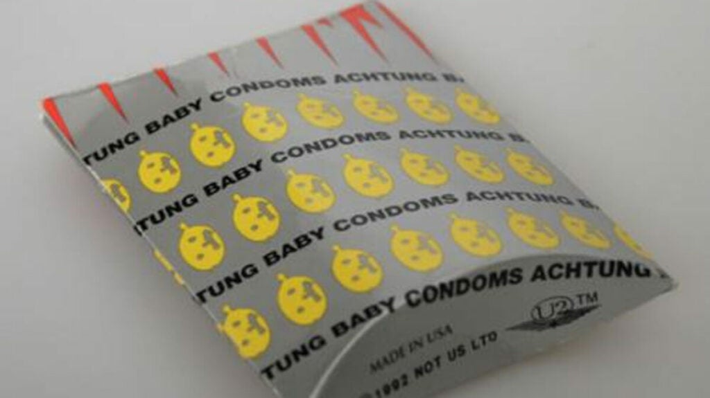 To emphasize this almost humorous shift, they launched some unexpected merchandise items during the concerts: condoms (two in each pack) with a crossed-out baby on them and the words “Achtung Baby!” Obviously, at this point, they can’t be used (who would want to?), but if you’re curious, you might be able to find a pack for around 20 euros. Unopened, of course. Naturally.