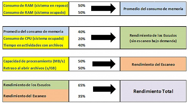 En cuanto al Rendimiento, se trata de la eficiencia y velocidad del antivirus a la hora de analizar archivos y vigilar. Su cálculo -también con datos de Virus Bulletin- es más complejo, ya que tenemos en cuenta los siguientes factores: