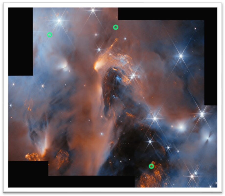 A continuación puedes ver tres de estos planetas rebeldes, rodeados en verde. Se encuentran a unos 1.000 años luz de nuestra galaxia y habitan en la nebulosa NGC1333, una enorme región de polvo y gas donde se forman estrellas.