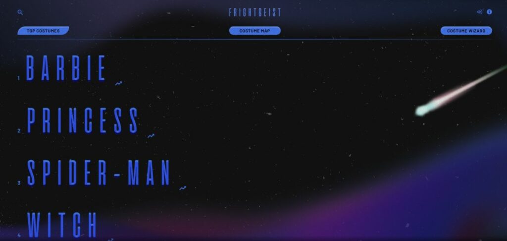Frightgeist tiene la primicia de los disfraces más buscados esta temporada, junto con un mapa que muestra las tendencias en distintas partes de Estados Unidos. También está el útil “Costume Wizard” de Google, que ofrece ideas para hacer algo único.