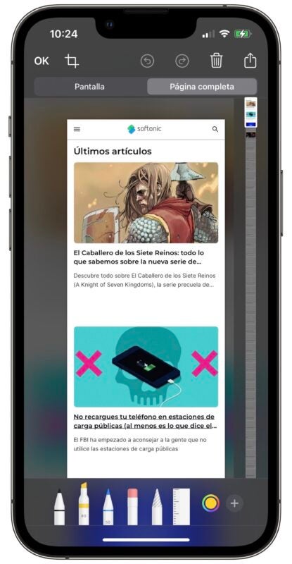 Y hay más, pues nuestro iPhone puede tomar capturas todavía mejores, más completas. Cuando nos encontramos en una página web, un correo o un documento podemos elegir realizar una captura a Página completa para captar todo el contenido en una misma imagen.