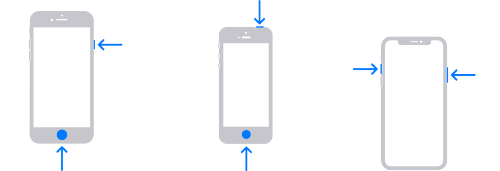 - iPhone y iPad con botón Home: presionamos el botón Home (el frontal, bajo la pantalla) y el botón de la parte lateral derecha o de la parte superior al mismo tiempo.
