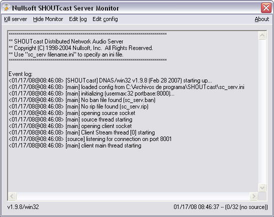 Para ejecutar el servidor sólo tienes que hacer doble clic en el ejecutable “sc_serv.exe” en la carpeta “Archivos de programa/SHOUTcast”. Inmediatamente, podrás ver la consola del servidor. Si todo ha ido bien verás una captura similar a esta: