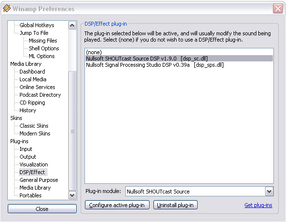 Baja hasta la opción “DSP/Effect” y haz clic en “Null SHOUTcast Source DSP”, el plugin que hemos instalado para enviar las reproducciones al servidor.