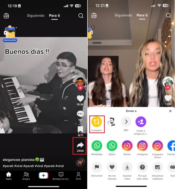 De esta manera tan simple y sencilla puedes repostear vídeos en tu cuenta personal. Puedes hacerlo con cualquiera de los que veas siempre y cuando estén en abierto (los perfiles, claro).