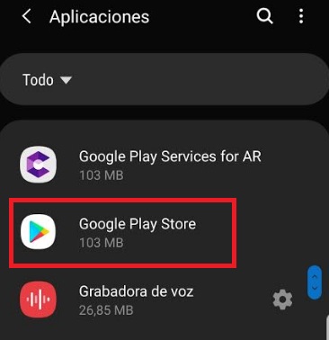 En primer lugar accede a los ajustes de tu teléfono y pulsa en la opción “Aplicaciones”. Localiza en la lista la entrada “Google Play Store” y pulsa en ella. Esto te llevará a una nueva pantalla con todas las opciones de configuración de la app.