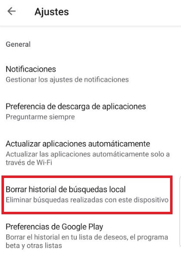 Ya dentro de la ventana de ajustes de la Play Store, pulsa en la opción “Borrar historial de búsquedas local”. Tras ello comprueba si sigues teniendo problemas a la hora de descargar una aplicación a tu móvil.
