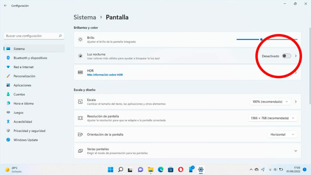 Otra de las características de Windows 11 es su sistema de luz nocturna. Esto hace que los colores se vuelvan más cálidos según la hora del día que establezcamos. Para activarlo, haz esto: