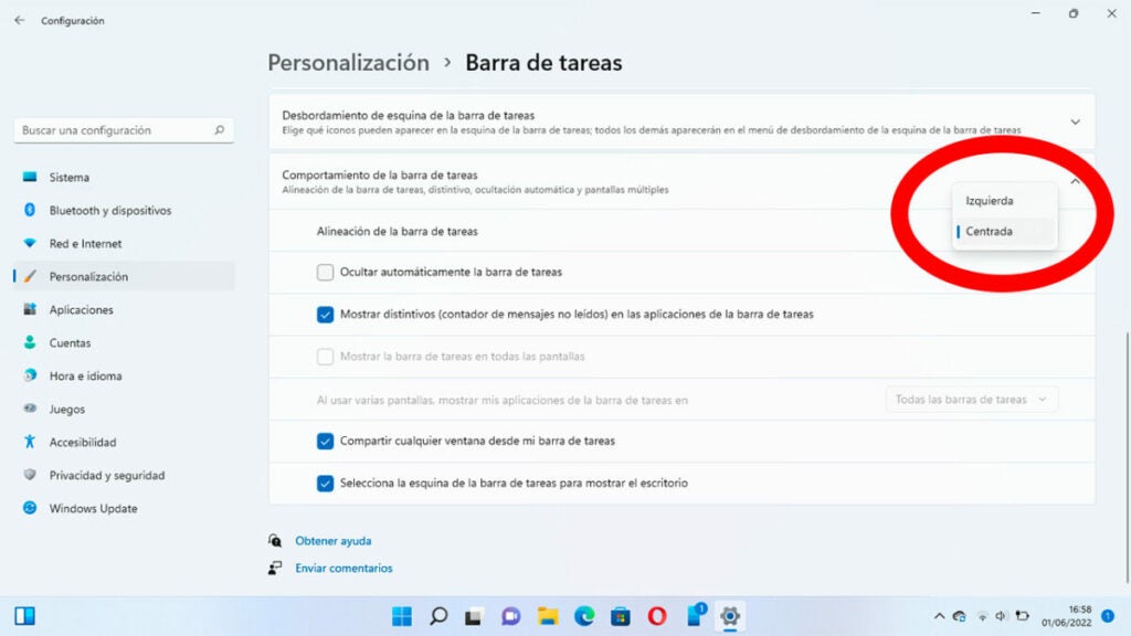 - En Alineación de barra de tareas, cambia Centrada y selecciona Izquierda.