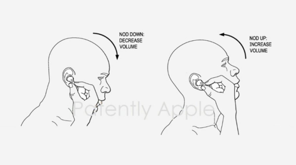 Luego están las dos patentes. La primera es clarísima. Patently Apple nos habla de una patente para controlar los AirPods con movimientos de cabeza. Algo tan simple como tocar el AirPods mientras bajamos la cabeza para bajar el volumen o la subimos para subirlo. ¿Suena eso a casco de realidad aumentada?