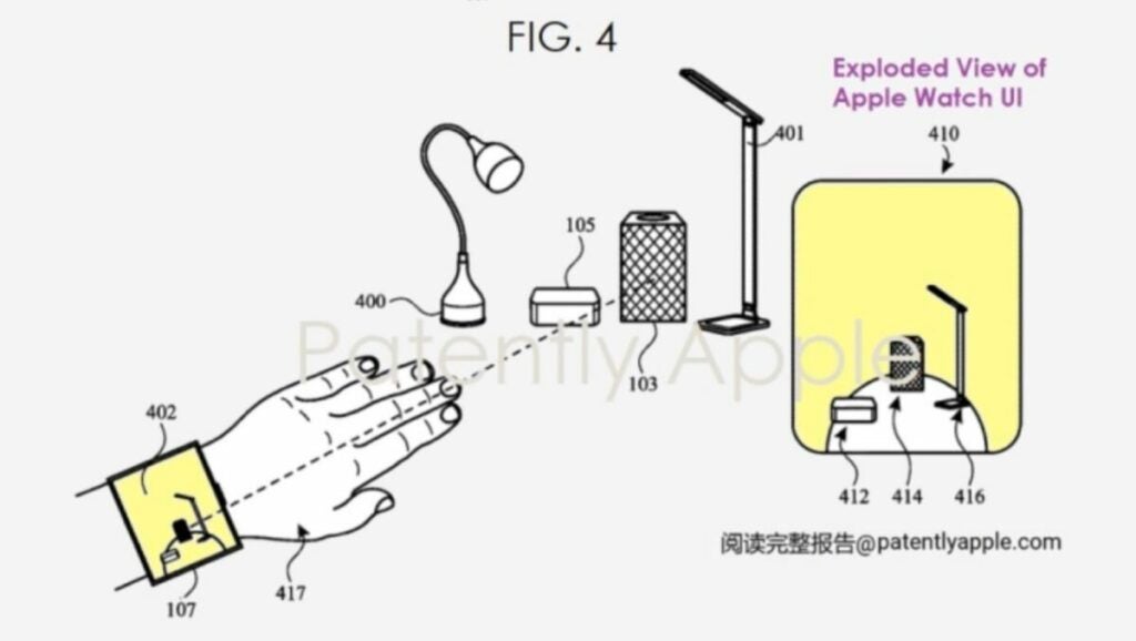 También recogida por Patently Apple, esta nos habla de la posibilidad de controlar accesorios HomeKit al señalarlos con la mano donde llevamos el Apple Watch. Esto permitiría al reloj mostrar una interfaz de control que, por la dirección en la que señaláramos, sabría sobre qué dispositivo queremos actuar.