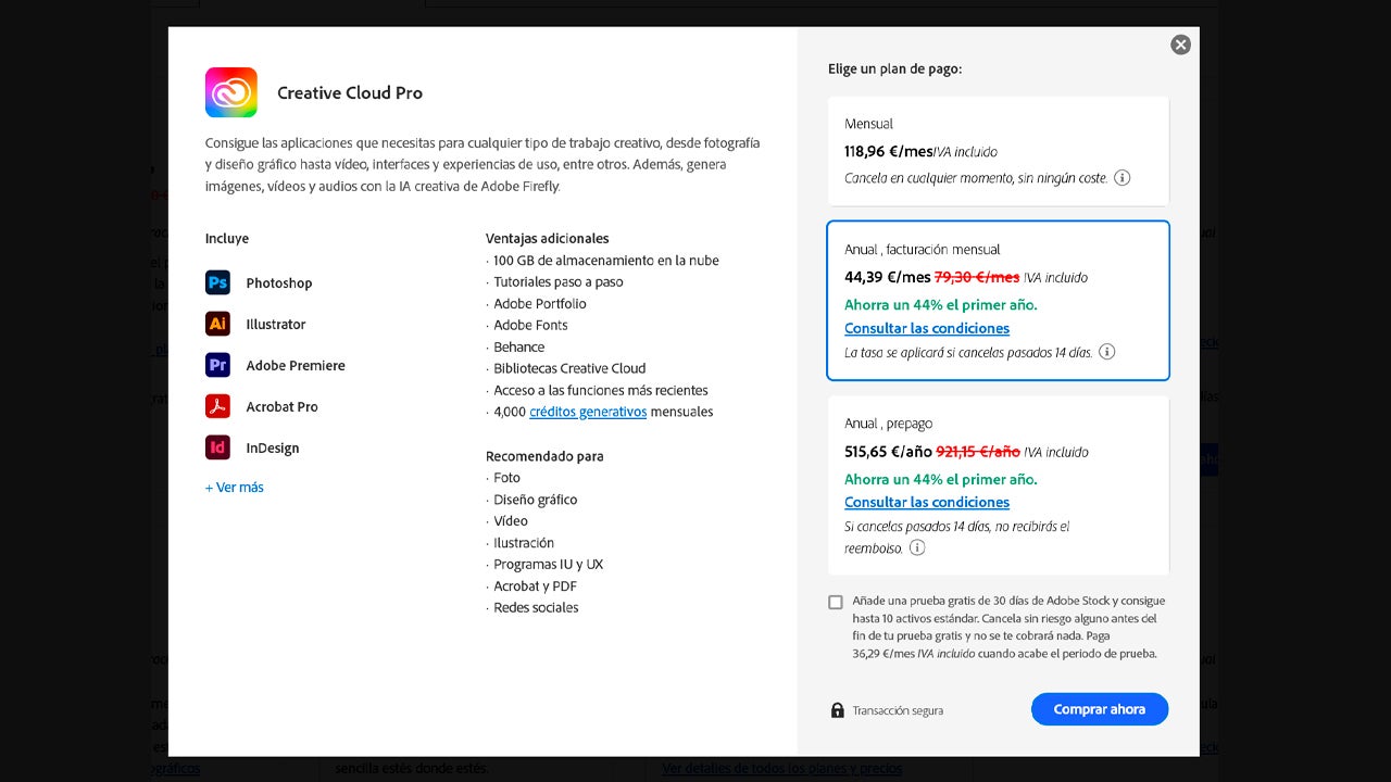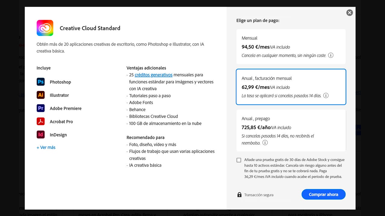 Creative Cloud Standard es muy parecido al plan Pro, ya que también incluye el mismo número de aplicaciones. La diferencia es que trae menos funciones de IA. En el caso de que solo te interese un programa en concreto, puedes suscribirte a dicho programa por un precio más reducido.