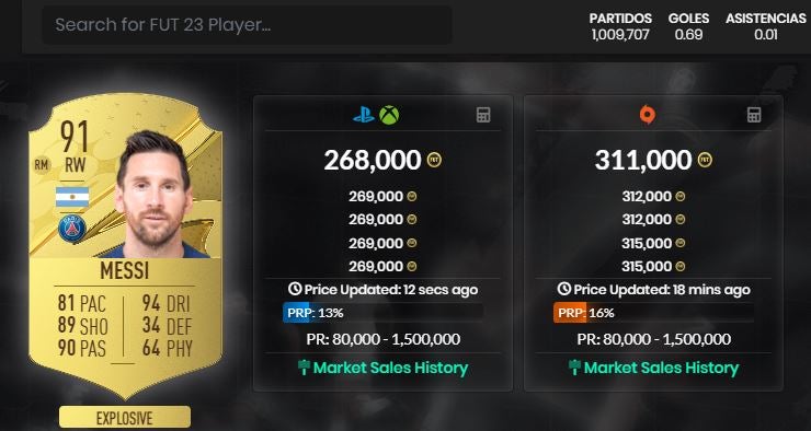 Por esta sencilla razón, consultar el historial de precios de cada carta es tan importante. Nos va a determinar si estamos pagando por encima o por debajo del precio “habitual”. Un ejemplo real: Messi ahora mismo cuesta 268.000 monedas, pero hace sólo una semana alcanzó un precio de 370.000 monedas. Si vas jugando con esta información sabrás en qué momento comprar y vender cada carta.