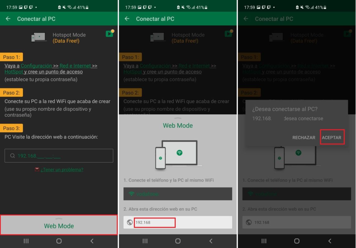 Xender abrirá una ventana para conectar todo, pero nuestra recomendación es que cliquees sobre “Web Mode” en la parte inferior. Si lo haces, Xender sacará una nueva ventana con una dirección IP. Cópiala e introdúcela en el navegador. Cuando lo hagas, el smartphone te dirá si quieres dar permiso al PC para que se conecte. Pulsa en “Aceptar” y listo, ya tendrás todo hecho.